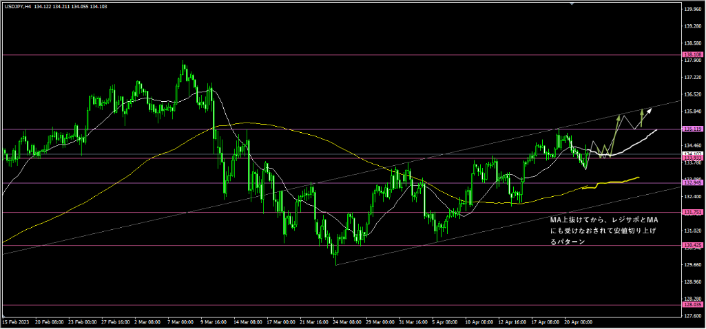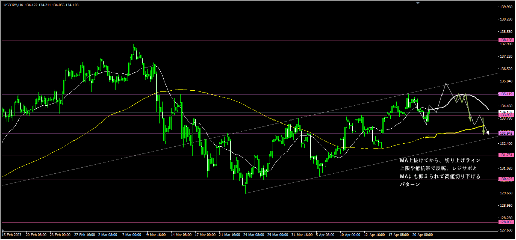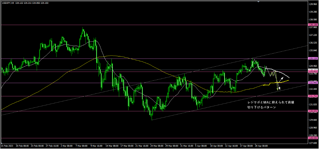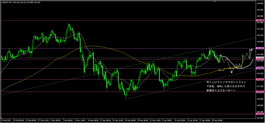 ここからさらに下げる場合はMAを下抜けてから戻り売りを検討するが、切り上げラインが近くなるようなら反発上昇してからの買いも検討する。