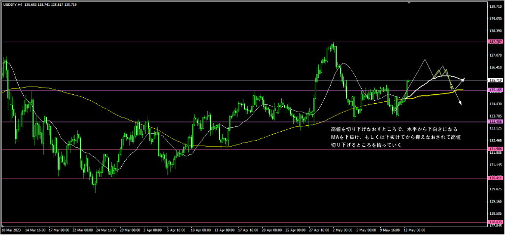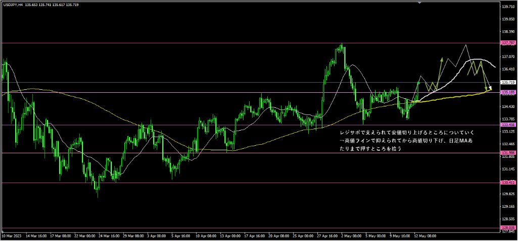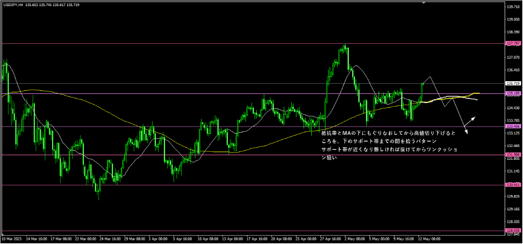 このあと下げるようなら、日足と週足MA、サポート帯を下抜けてから戻り売りを拾っていきたいところです。
