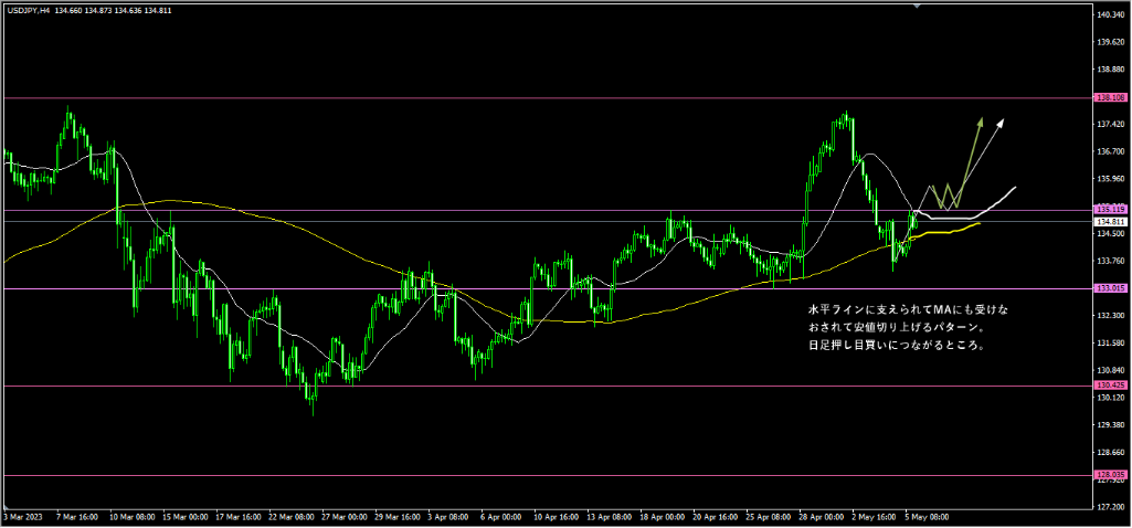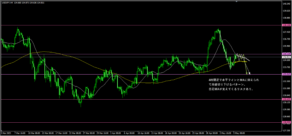ただし4時間足MAは越えているものの抵抗ラインよりは下、ということで売り買いの思惑が交錯する状況になっていたかと思います。