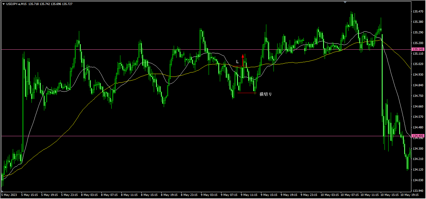 安値切り上げて反転するところで買いましたが、切り返されて安値更新したところで損切りとなりました。