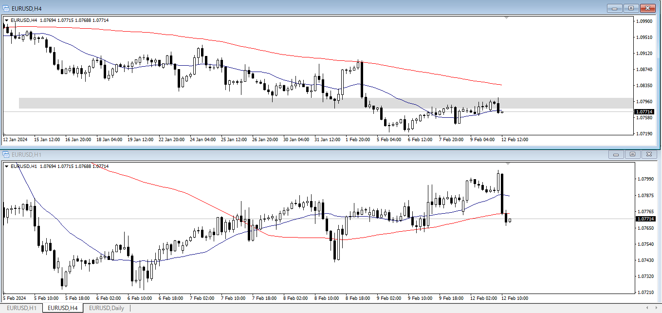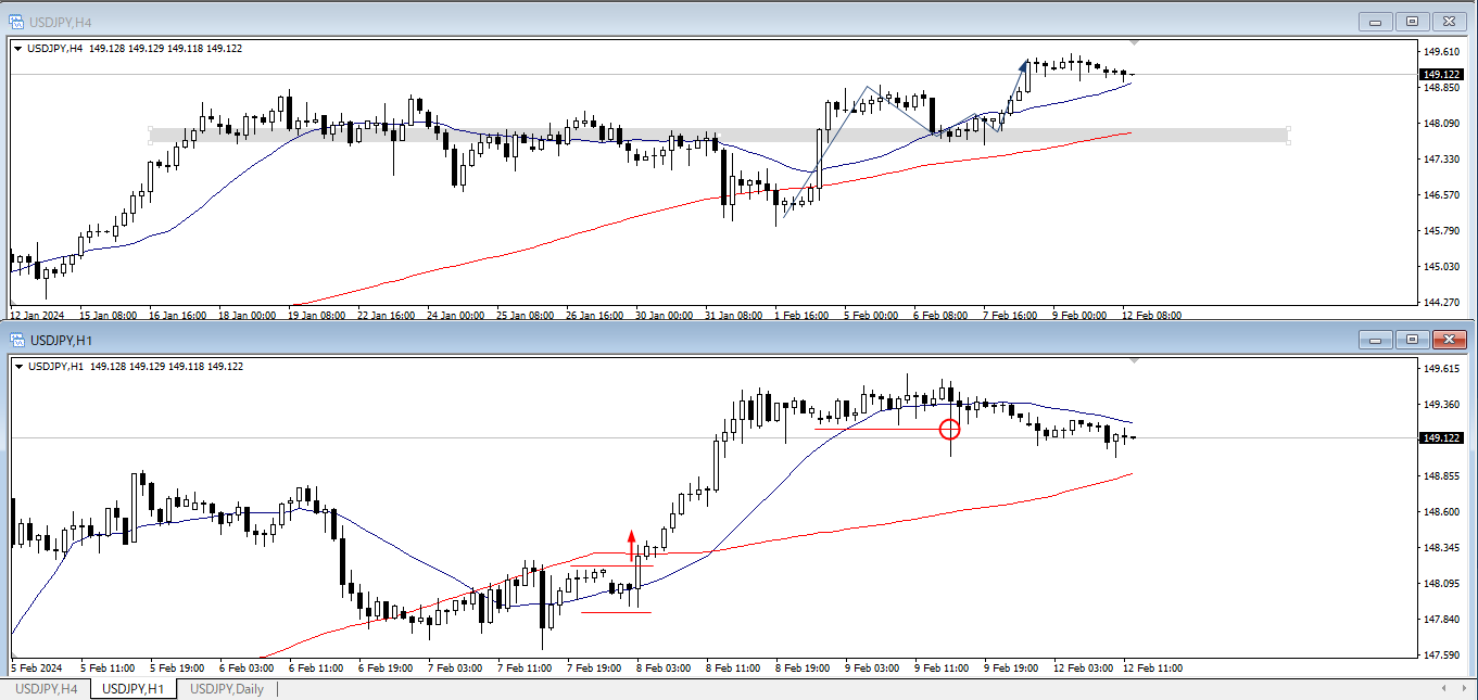 4時間足で短期的に安値切り上げてましたが太い線に抑えられているので買うことはできず、またMAも支えてきているので売ることもできない、という判断でした。