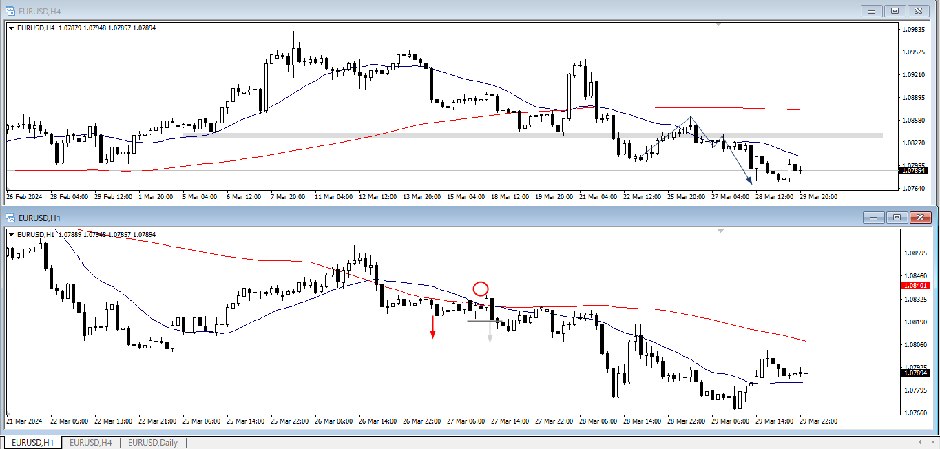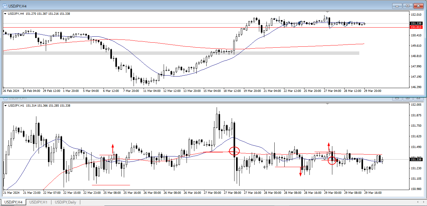 2回目の売りは下抜けたMAに抑えられて高値切り下げ、日足MAまでのスペースを埋める動きを見ていました
