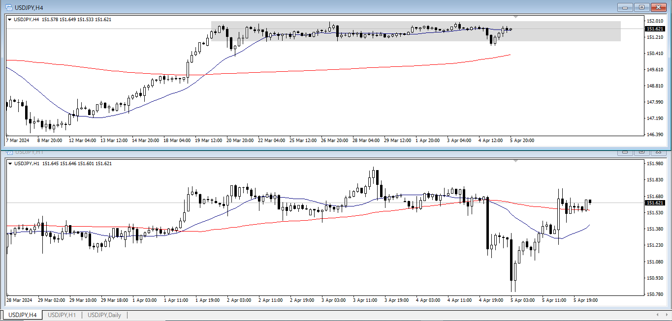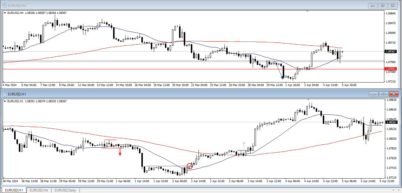 太い線とMAに戻りをつけて、1時間足高値切り下げで売りました。